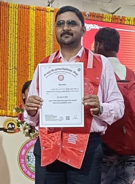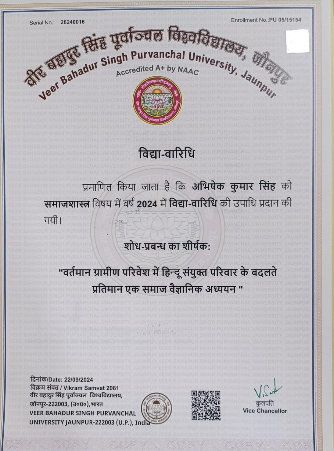 Dr. Abhishek Kumar Singh, Assistant Professor, Department of Sociology in Feroze Gandhi College, Rae Bareli was awarded Ph.D. degree in Sociology for his doctoral research thesis entitled “वर्तमान ग्रामीण परिवेश में हिंदू समाज के बदलते प्रतिमान – एक समाज वैज्ञानिक अध्ययन” (“Vartmaan Graameen Parivesh Me Hindu Samaaj Ke Badalte Pratimaan- Ek Samaaj Vaigyaanik Adhyayan”) under the supervision of Prof. (Mrs.) Krishna Singh in the Convocation of Veer Bahadur Singh Purvanchal University, Jaunpur held on 22.09.2024.