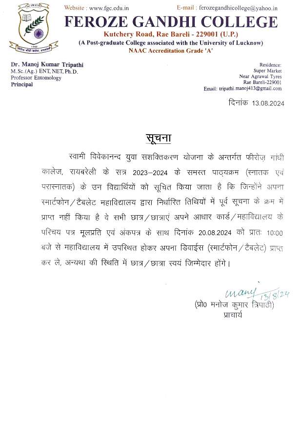 - FGC- RBL/13.08.2024/Programme for the distribution of smart phones and tablets to remaining eligible students on 20.08.2024