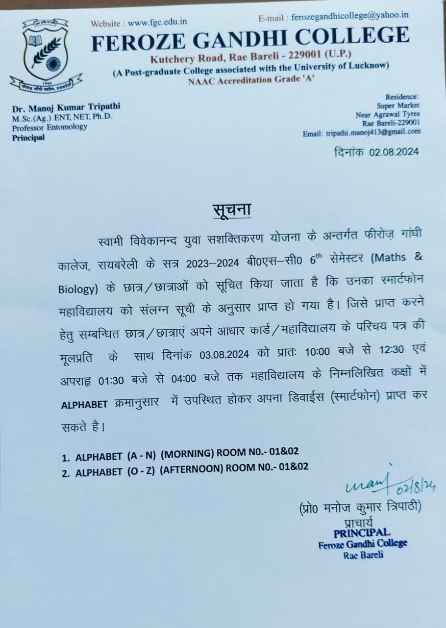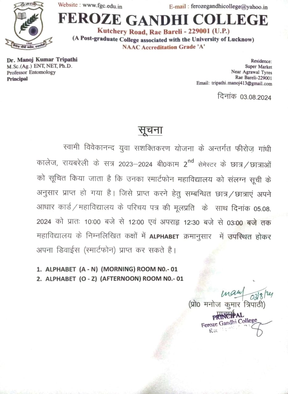 - FGC- RBL/Dt.: 08.08.2024/Programme for the distribution of smart phones to B.A. (6th Semester), 2023- 24 class on 09.08.2024.