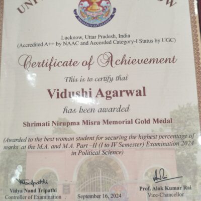(i) Gold Medal awarded to Vidushi Agarwal, M.A. (Political Science), Semester IV, 2023- 24: Vidushi Agarwal, a Post Graduate student of the Department of Political Science in Feroze Gandhi College, Rae Bareli was awarded Smt. Nirupma Mishra Memorial Gold Medal, 2024 in the 67th Convocation of the University of Lucknow held on 16.09.2024 for having secured the highest aggregate percentage of marks in M.A. (Political Science) Programme (Semester- I to Semester- IV), 2022- 24 of the University of Lucknow.