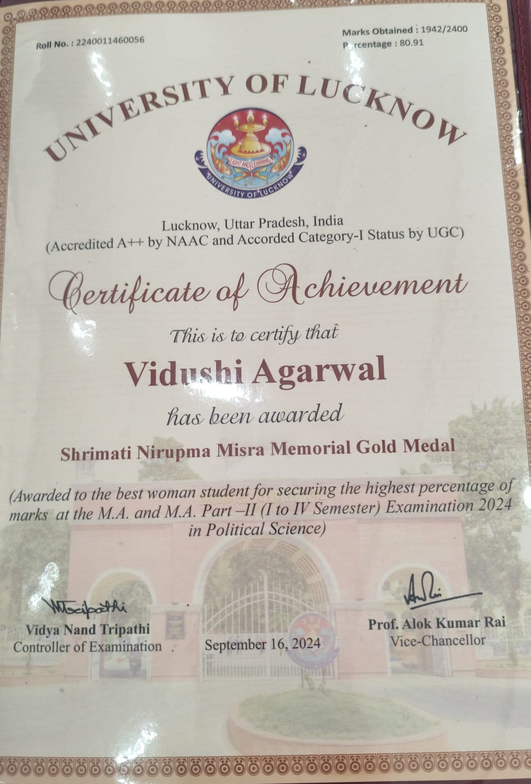 (i) Gold Medal awarded to Vidushi Agarwal, M.A. (Political Science), Semester IV, 2023- 24: Vidushi Agarwal, a Post Graduate student of the Department of Political Science in Feroze Gandhi College, Rae Bareli was awarded Smt. Nirupma Mishra Memorial Gold Medal, 2024 in the 67th Convocation of the University of Lucknow held on 16.09.2024 for having secured the highest aggregate percentage of marks in M.A. (Political Science) Programme (Semester- I to Semester- IV), 2022- 24 of the University of Lucknow.