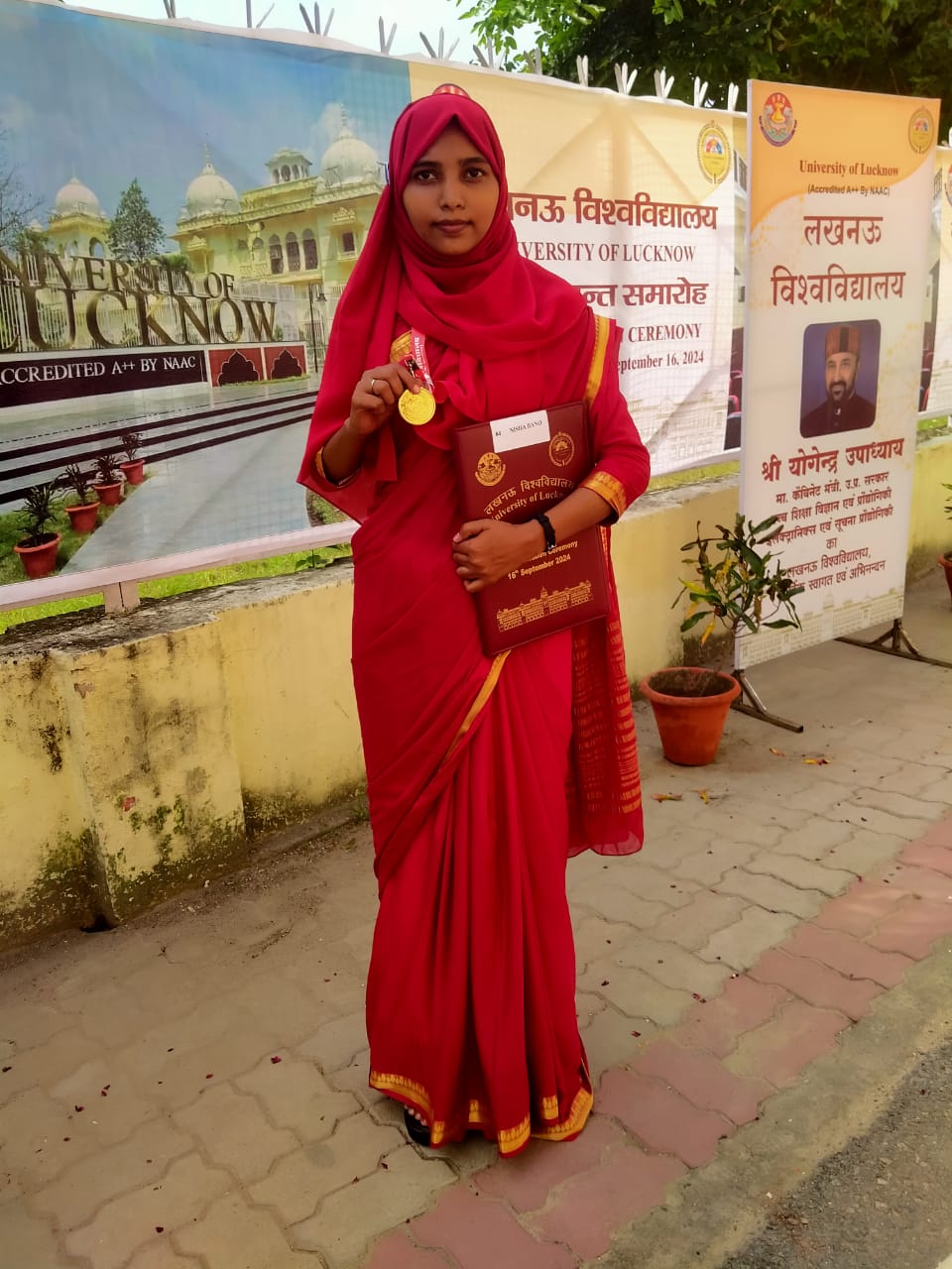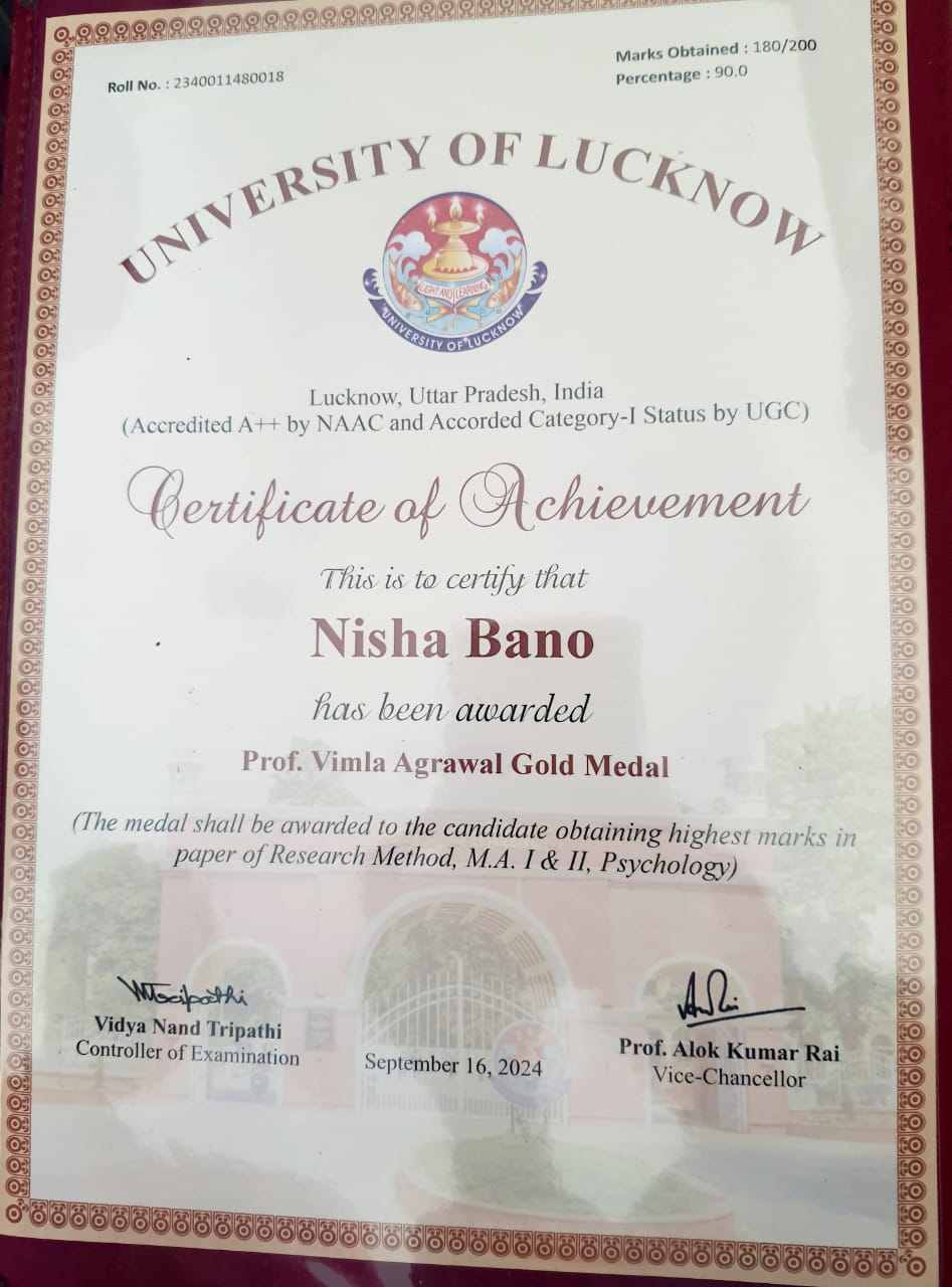 (iii) Gold Medal awarded to Nisha Bano, M.A. (Psychology), Semester- II, 2023- 24: Nisha Bano, a Post Graduate student of the Department of Psychology in Feroze Gandhi College, Rae Bareli was awarded Prof. Vimla Agarwal Gold Medal, 2024 in the 67th Convocation of the University of Lucknow held on 16.09.2024 for having secured the highest aggregate percentage of marks in the papers of Reaserch Methods in M.A. (Psychology) (Semester- I), 2023- 24 and M.A. (Psychology) (Semester- II), 2023- 24 examinations of the University of Lucknow